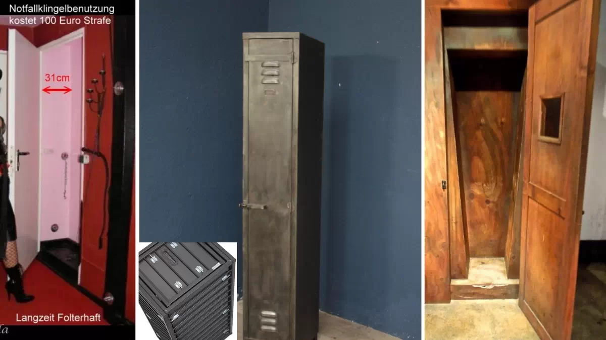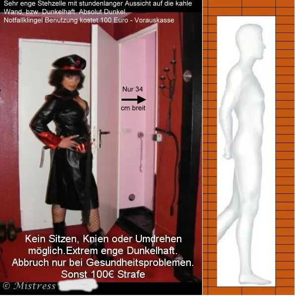 Eine Stehzelle (z.B. 48x48 und kleiner) ist so eng, das sich der Verurteilte nicht hinsetzen kann. Er starrt die ganzen Stunden nur gegen eine Wand. Nach 30 Minuten fangen die Füße an zu schmerzen und es wird immer schmerzhafter. Die Spindhaft ist noch enger. Er kannsich kaum noch rühren. Jede Minute kommt dem Delinquenten wie eine Ewigkeit vor und er weiss nicht wie er die nächsten 10 Minuten überstehen soll. Hat aber noch einige Stunden vor sich. Außer in den ganz engen Spinden, werden vor dem Wegschließen dem Häftling die Hande mit Handschellen Irish 8:-) auf dem Rücken gefesselt damit er nicht onanieren kann. Ich knüpfe gerade Kontakte zu Ladys, die im Studio über eine Stehzelle verfügen oder Spint-Haft anbieten. Was mich an dieser Strafe fasziniert, ist dass man sie sowohl als Strafe, als auch als Folter einsetzten kann, wobei mich die letztere Variante am meisten begeistert. Der Ablauf: Ich verurteile den Sklaven je nach Vergehen zu einer bestimmten Anzahl an Stunden in der Stehzelle/Spindhaft. Mit dem Urteil meldet er sich dich dann bei der Dame die das Urteil vollstreckt. Er leistest eine Anzahlung und vereinbart den Hafttermin. Nach jeder Haftstrafe wird der Delinquent im Anschluß ausgepeitscht.
