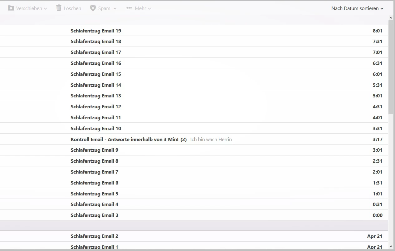 Der Schlafentzug als Foltermethode Der Schlafentzug ist eine meiner bevorzugten Bestrafungsmethoden bei der Onlineerziehung. Ich setzte diese Strafe aber nur an freien Tagen oder am Wochenende ein. Also wenn die Sklaven danach nicht arbeiten müssen. Der Delinquent muss mir ab 23:00 Uhr alle 30 Min pünklich eine Email schicken. Zusätzlich läuft die Webcam mit Aufzeichnung. Durch die Webcamkontrolle ist auch zeitweises Stehen im der Zimmerecke mit streng auf dem Rücken verschränkten Armen möglich. Zusätzlich kontrolliere ich die Emails am nächsten Morgen. Sollte auch nur eine Email verspätet eingetroffen sein, gibt es eine extrem harte Kombinationsstrafe: Eiskalte Wechselschockduschen mit anschließender Auspeitschung! Der Schlafentzug ist gut in der Nacht vor Verhören oder vor Auspeitschungen einsetzbar, da ein unausgeschlafender Sklave erheblich schmerzempfindlich ist. Sie haben einen Termin mit einem meiner Sklaven und wollen das er zusätzlich leidet? Bitte schreiben sie mir 2 Tage vor dem Treffen ob sie beim Delinquenten in der Nacht zuvor Schlafentzug wünschen.